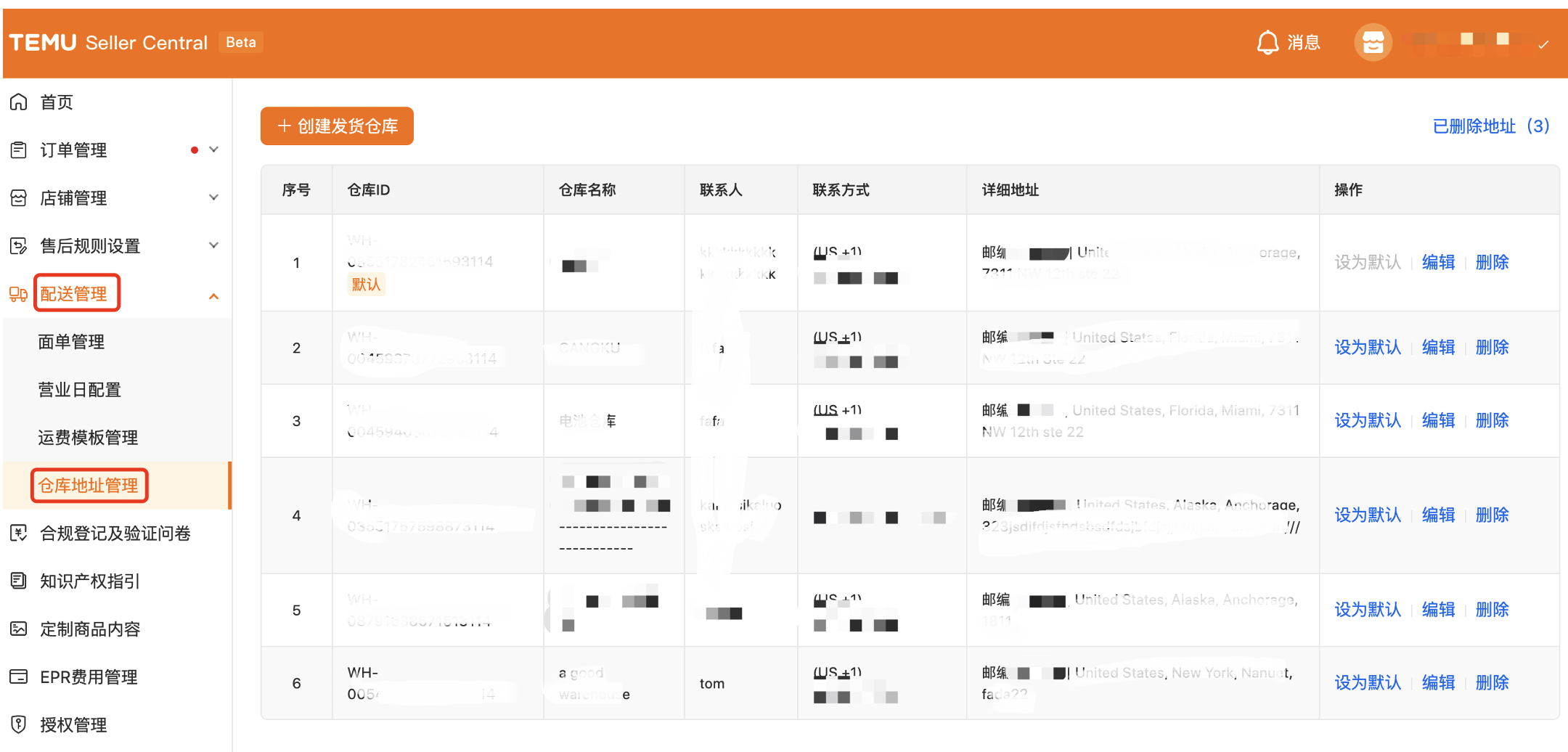 点击“配送管理”模块,进入“仓库地址管理”模块,商家可以查看发货仓库列表信息;