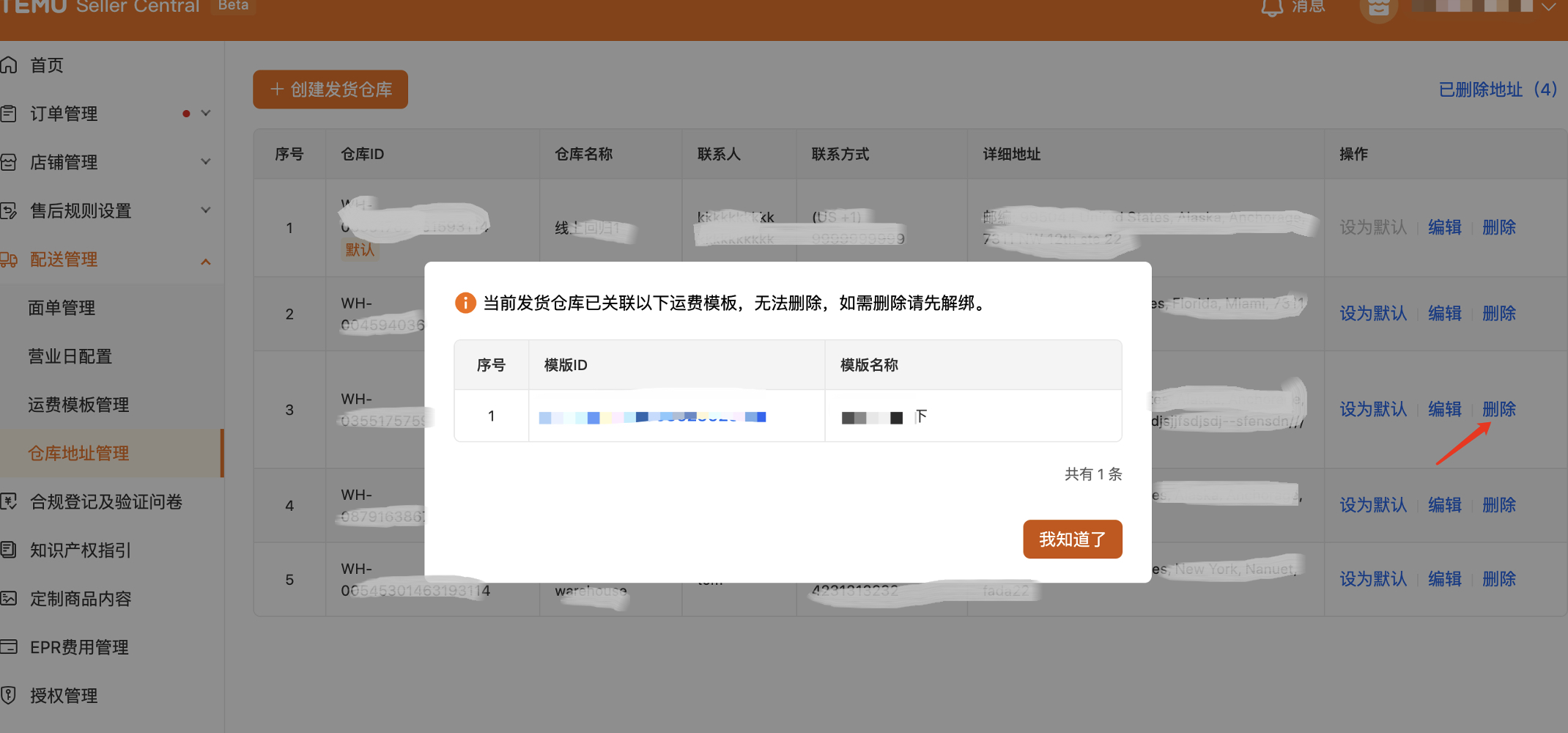 商家可以删除废弃的发货仓库。删除仓库前,需要先解绑仓库的配送模版。