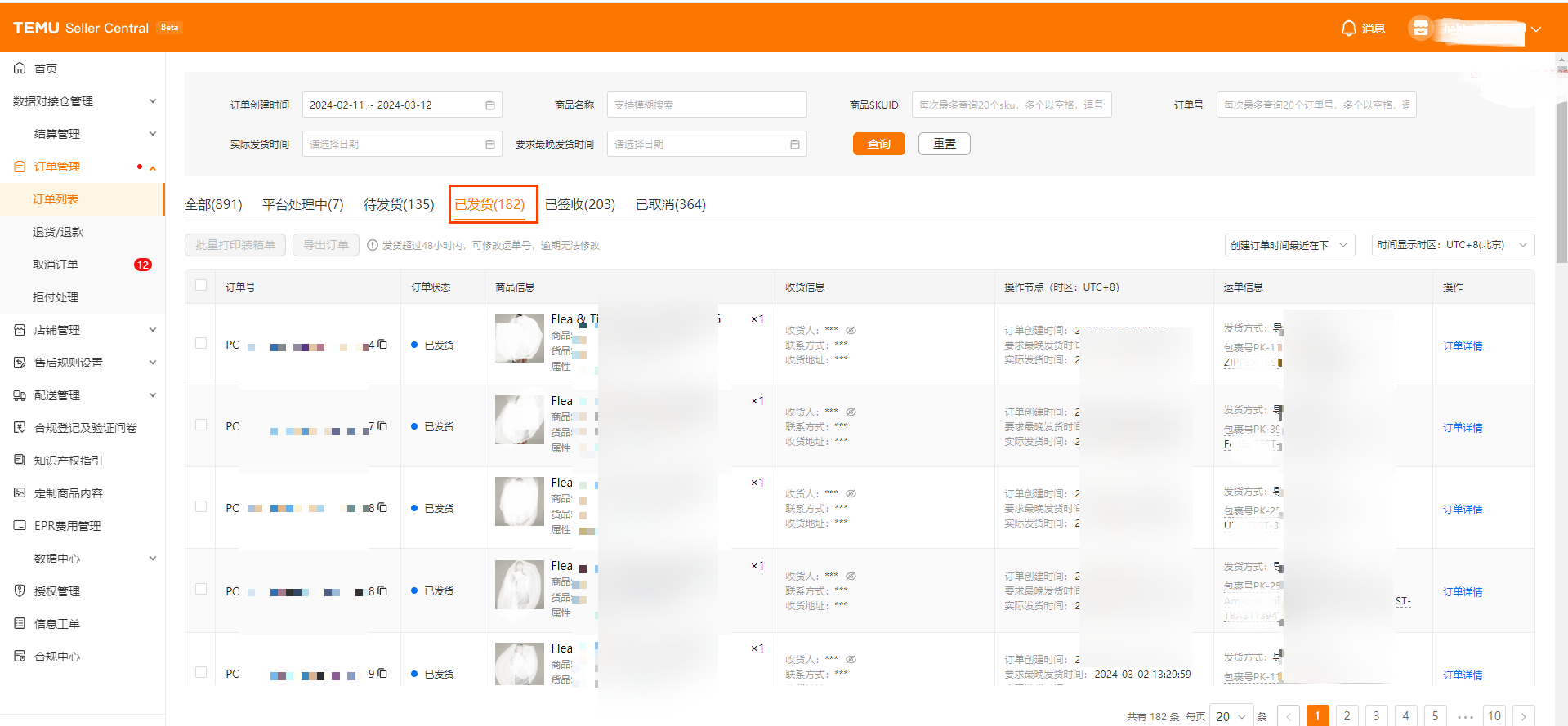 订单内所有商品都已发货后,订单进入已发货状态,在此状态下需密切关注包裹运输情况,确保消费者及时收到包裹: