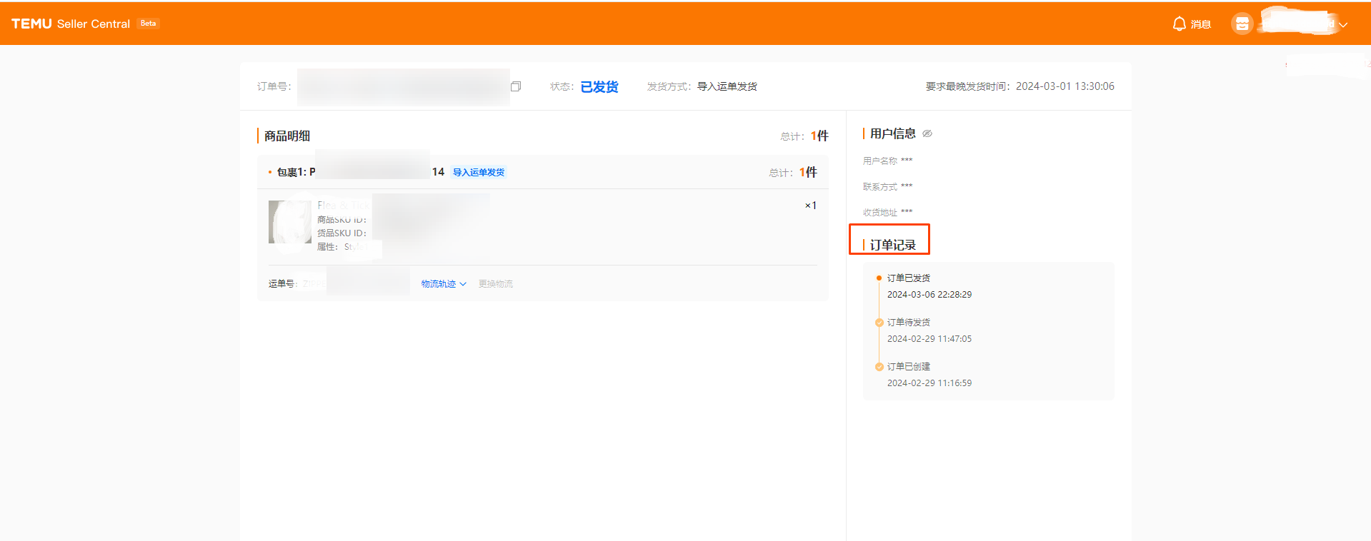 针对平台处理中、待发货、已发货、已签收订单,可点击查看订单详情,在该页面可进行相关操作并查看订单记录: